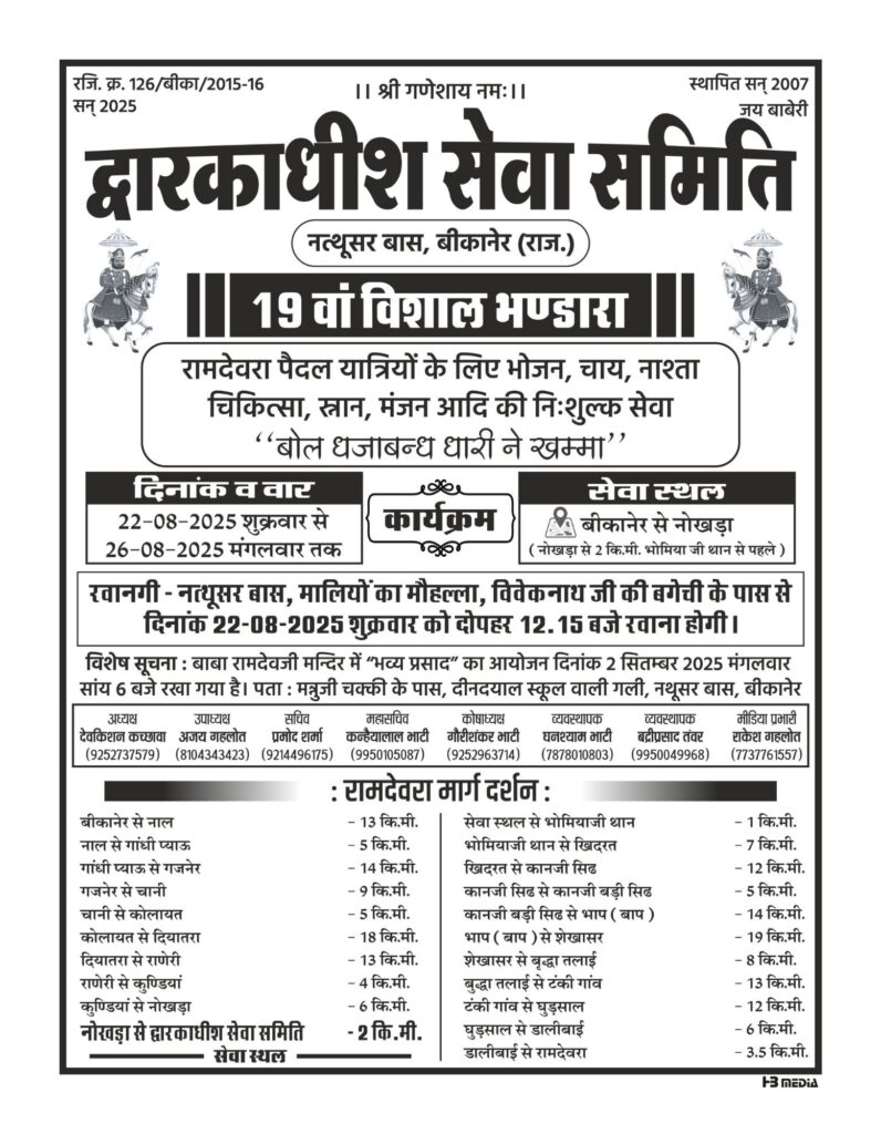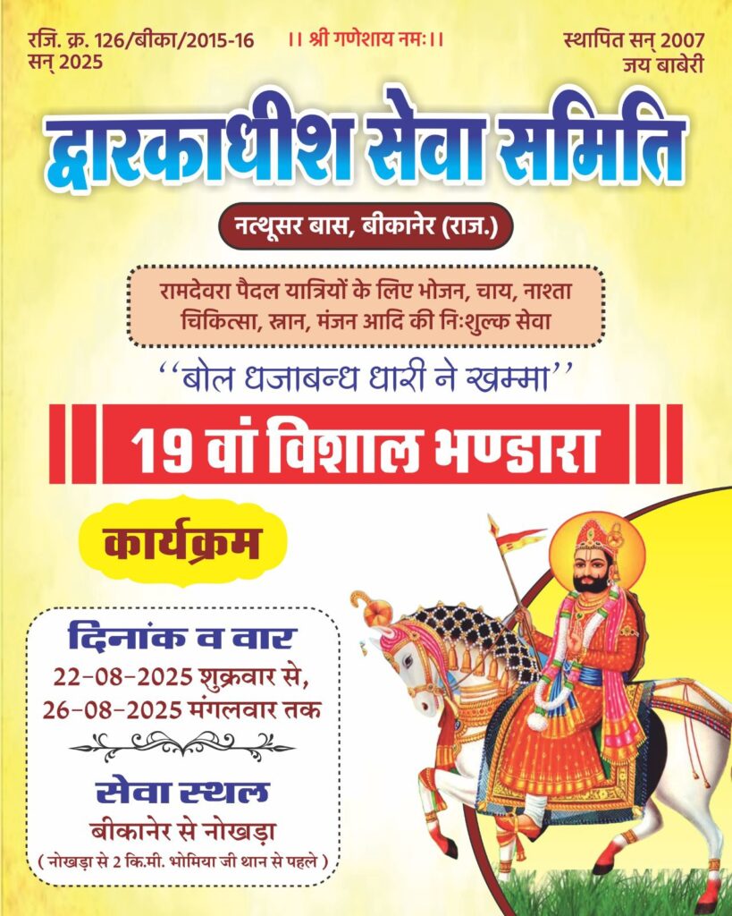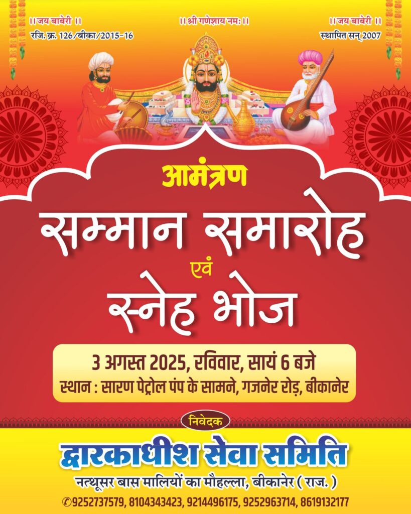 बीकानेर। द्वारकाधीश सेवा समिति का 19वां वार्षिक सम्मान समारोह आज दिनांक 3 अगस्त 2025, रविवार को सांय 6 बजे गजनेर रोड,सारण पेट्रोल पम्प के सामने भव्य रूप से आयोजित होगा। इस अवसर पर सेवा-समिति में अर्थिक सहयोग करने वाले भामाशाहों, कर्मठ कार्यकर्ताओं एवं समाज के प्रतिष्ठित जनों को सम्मानित किया जाएगा।